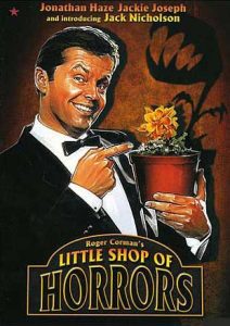 Perhaps the greatest movie ever shot in two days, Little Shop of Horrors was originally conceived as a followup to Roger Corman‘s black comedy A Bucket of Blood (1959). Jonathan Haze plays Seymour Krelboin, a schlemiel’s schlemiel who works at the Skid Row flower shop of Mr. Mushnick (Mel Welles). Experimenting in his spare time, Seymour develops a new plant species that he hopes will lead him to fame and fortune. Unfortunately, the mutated plant — named Audrey Junior, in honor of Seymour’s girlfriend Audrey (Jackie Joseph) — subsists on blood and human flesh.