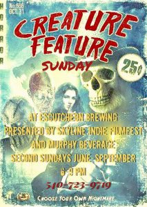 Join Murphy Beverage & Skyline Indie Film Fest at Escutcheon Brewing on the 2nd Sunday of every month, June-September, for Creature Features! Doors at 6:00 for a brewery tour, films at 6:30. Enjoy a beer and the movie! The event is free, but the hat will be passed for donations to support Skyline.