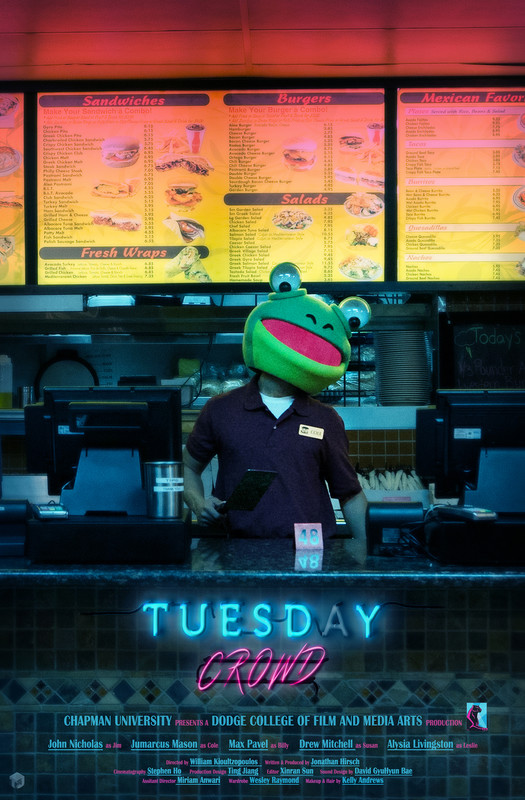 ![]() | Tuesday Crowd | Cole is a fry-cook at a greasy burger joint. When his graveyard shift replacement doesn’t show up, he finds himself stuck at work late into the night, missing his anniversary dinner with his girlfriend. | Narrative Short, Student - Dark Comedy | 00:19:35 |